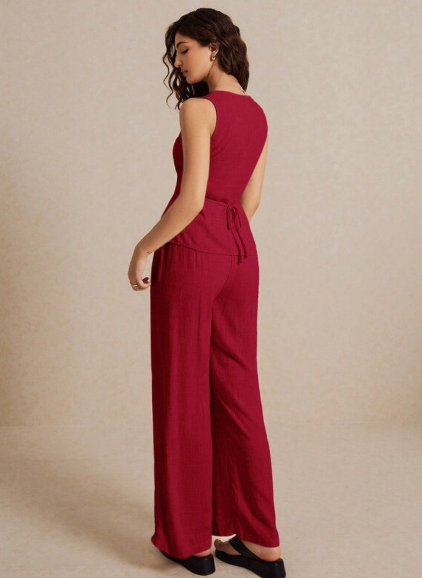 A timeless linen blouse with a clean, modern feel. Crafted from natural, breathable fabric, this sleeveless piece features a front button fastening and subtle, tailored lines — perfect for everyday wear, dinners and special occasions.